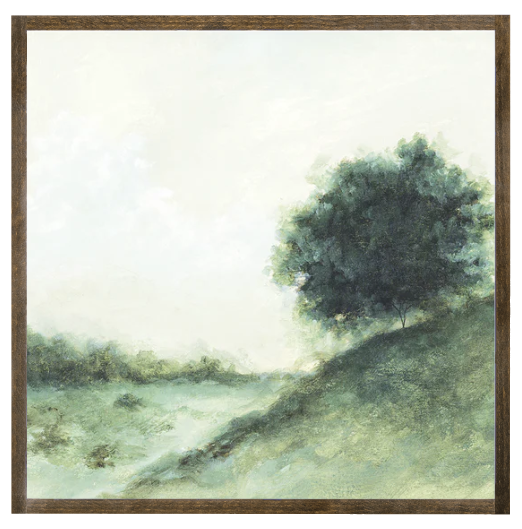 A gorgeous, vintage-inspired landscape, Under the Elm was painted exclusively for Joyfully Said by artist Tessa Brown. This piece includes predominately shades of green with some notes of blue, along with a gray/cream sky.
